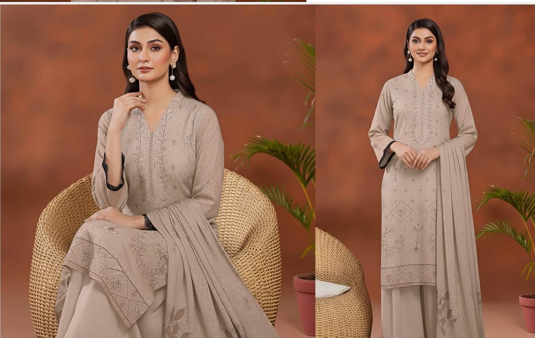 The richly embroidered patterns on soft slub fabric exude a graceful aesthetic, while the velvet shawl adds a touch of royal finesse. Perfect for winter festivities, family gatherings, and formal events, this ensemble captures the essence of Bareeze’s signature craftsmanship.