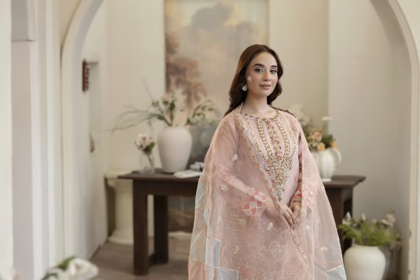 * The look is completed with an *embroidered organza dupatta*, creating a graceful, polished finish.