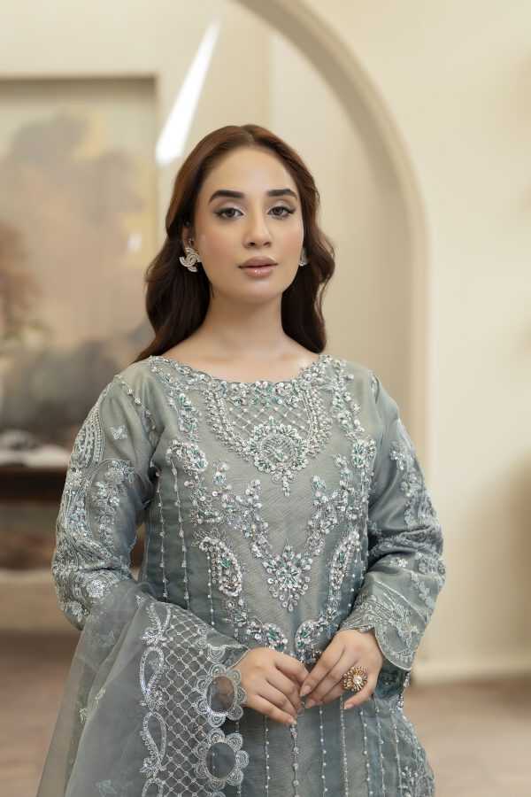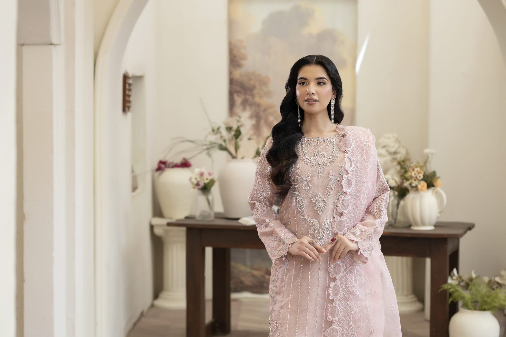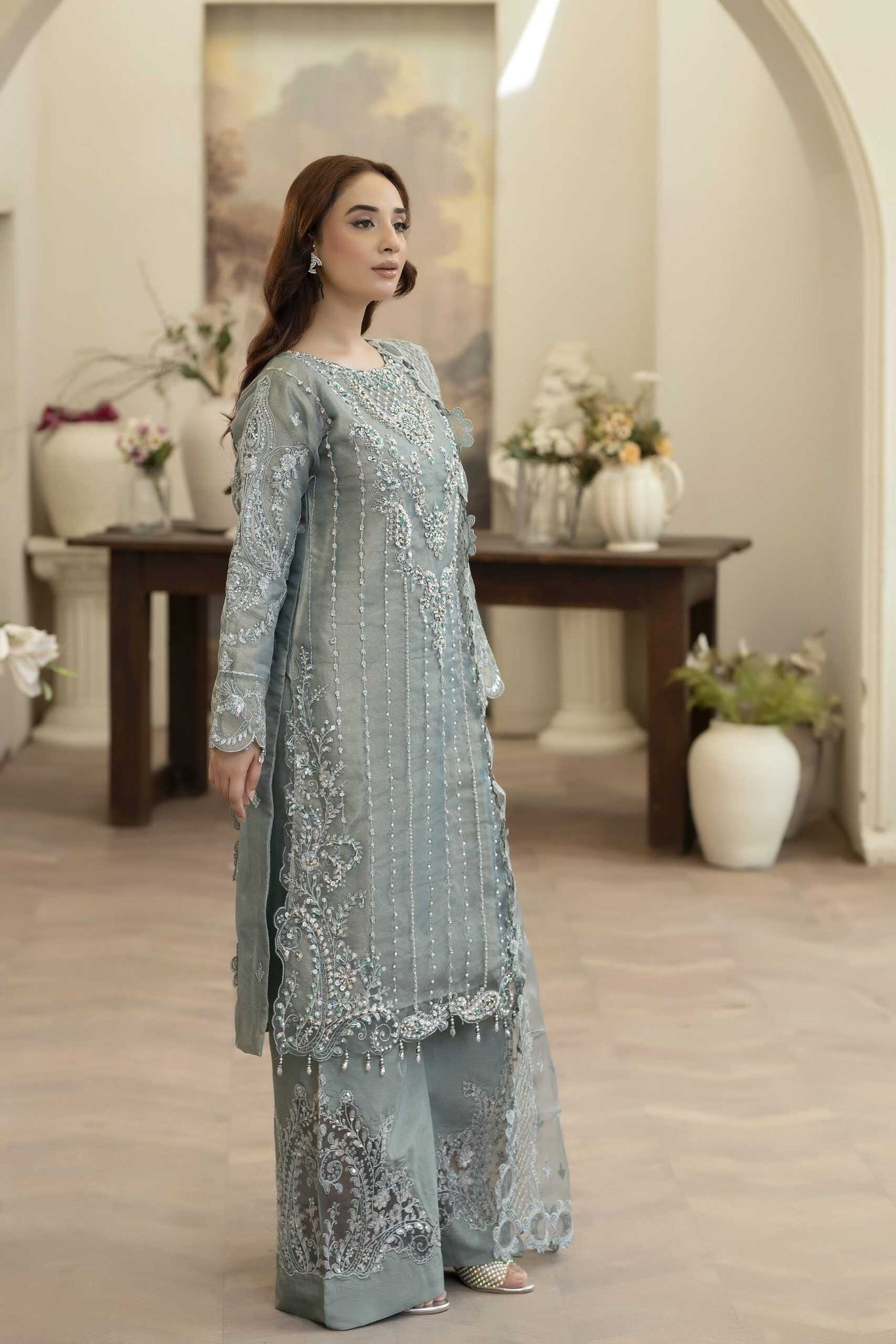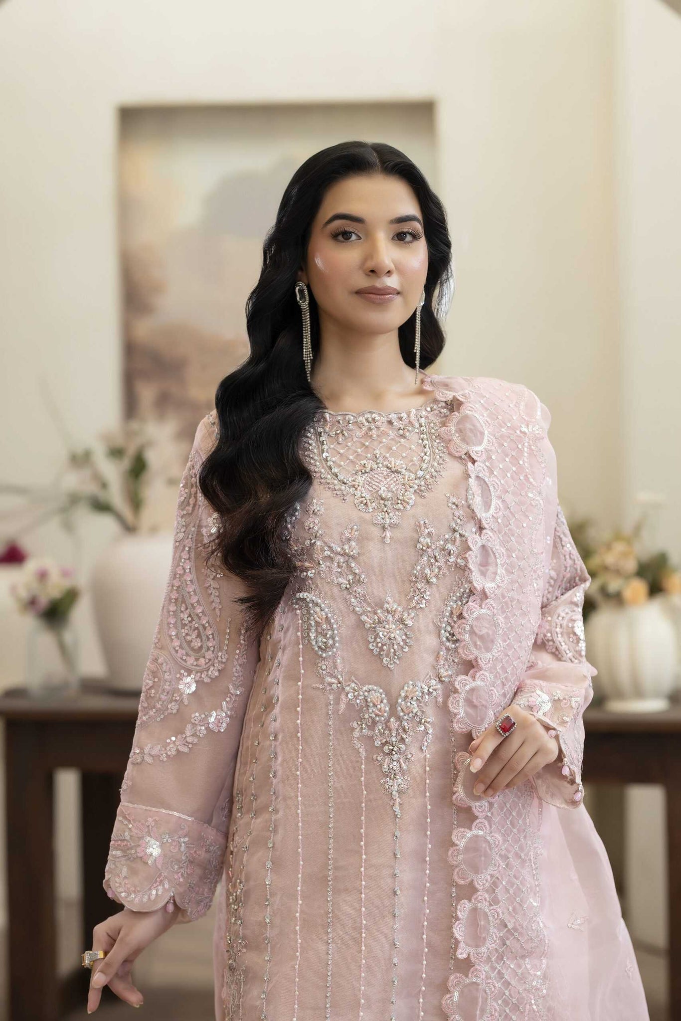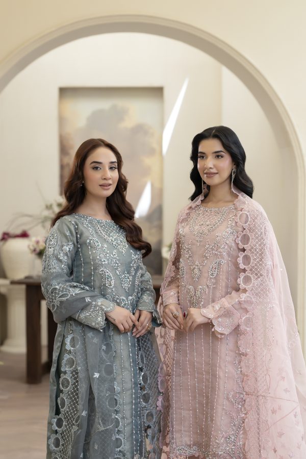 * The *organza embroidered dupatta* completes the look with refined elegance.