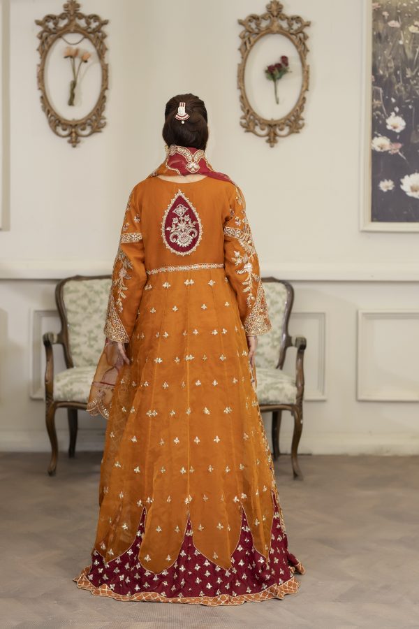4YOU-9078 – Mustard & Maroon Organza Front-Open Maxi 3-Piece Set | Embroidered Maxi, Trouser & Dupatta with Handmade Adda Work*