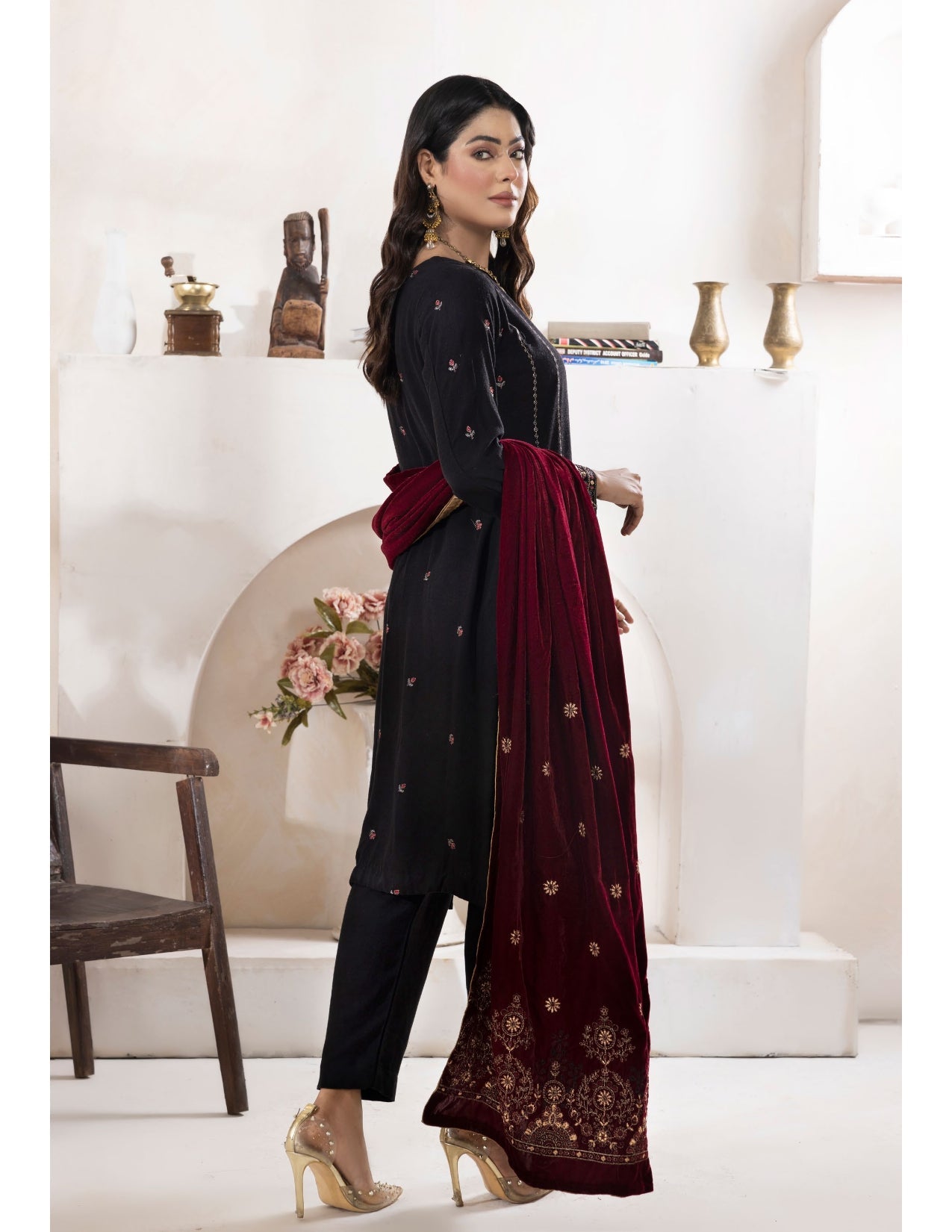 The richly embroidered patterns on soft slub fabric exude a graceful aesthetic, while the velvet shawl adds a touch of royal finesse. Perfect for winter festivities, family gatherings, and formal events, this ensemble captures the essence of Bareeze’s signature craftsmanship.