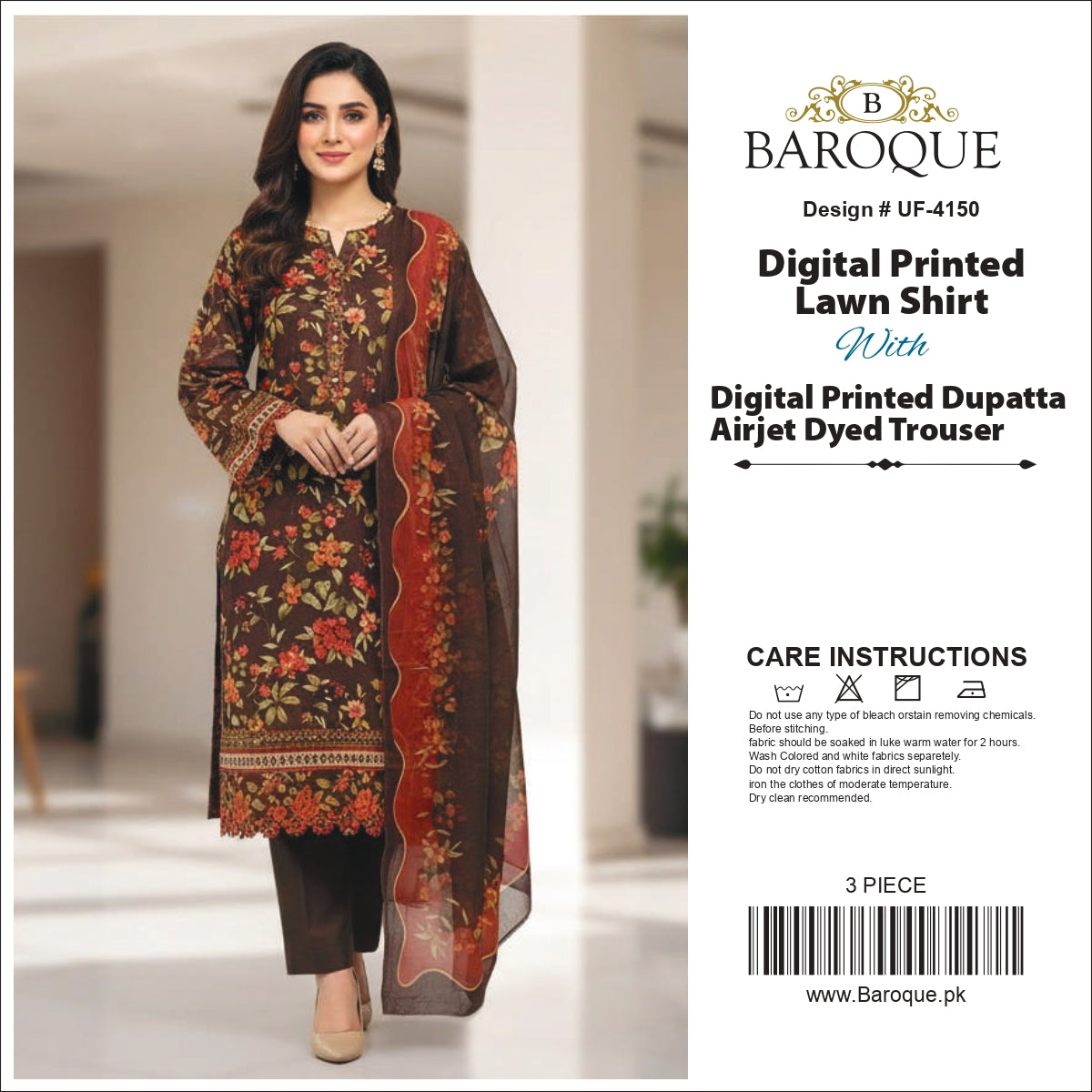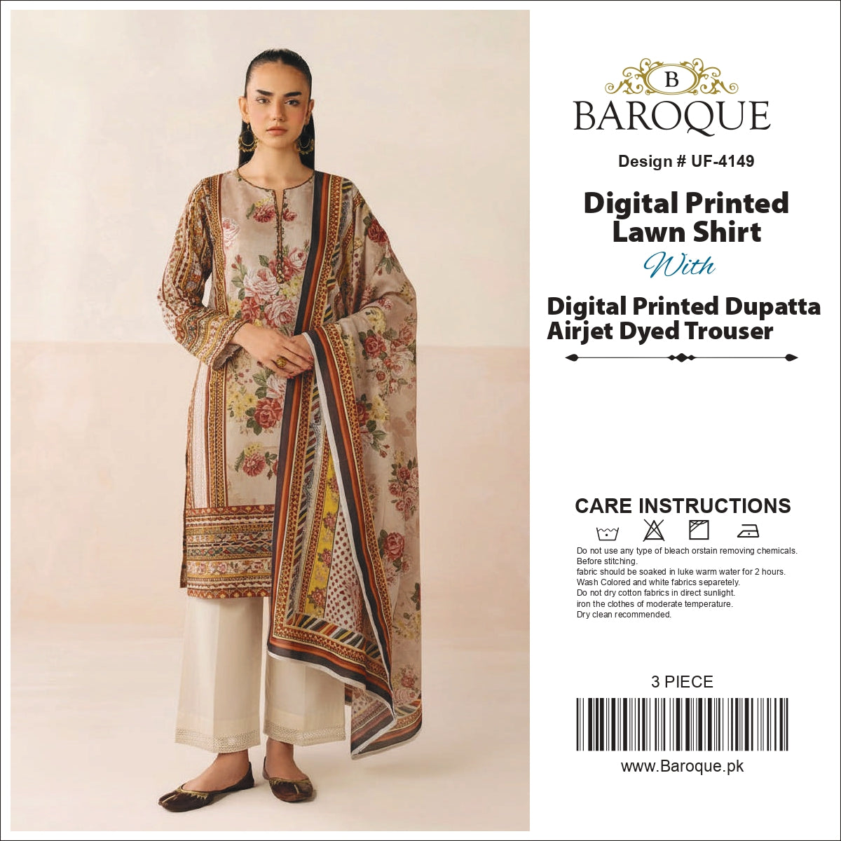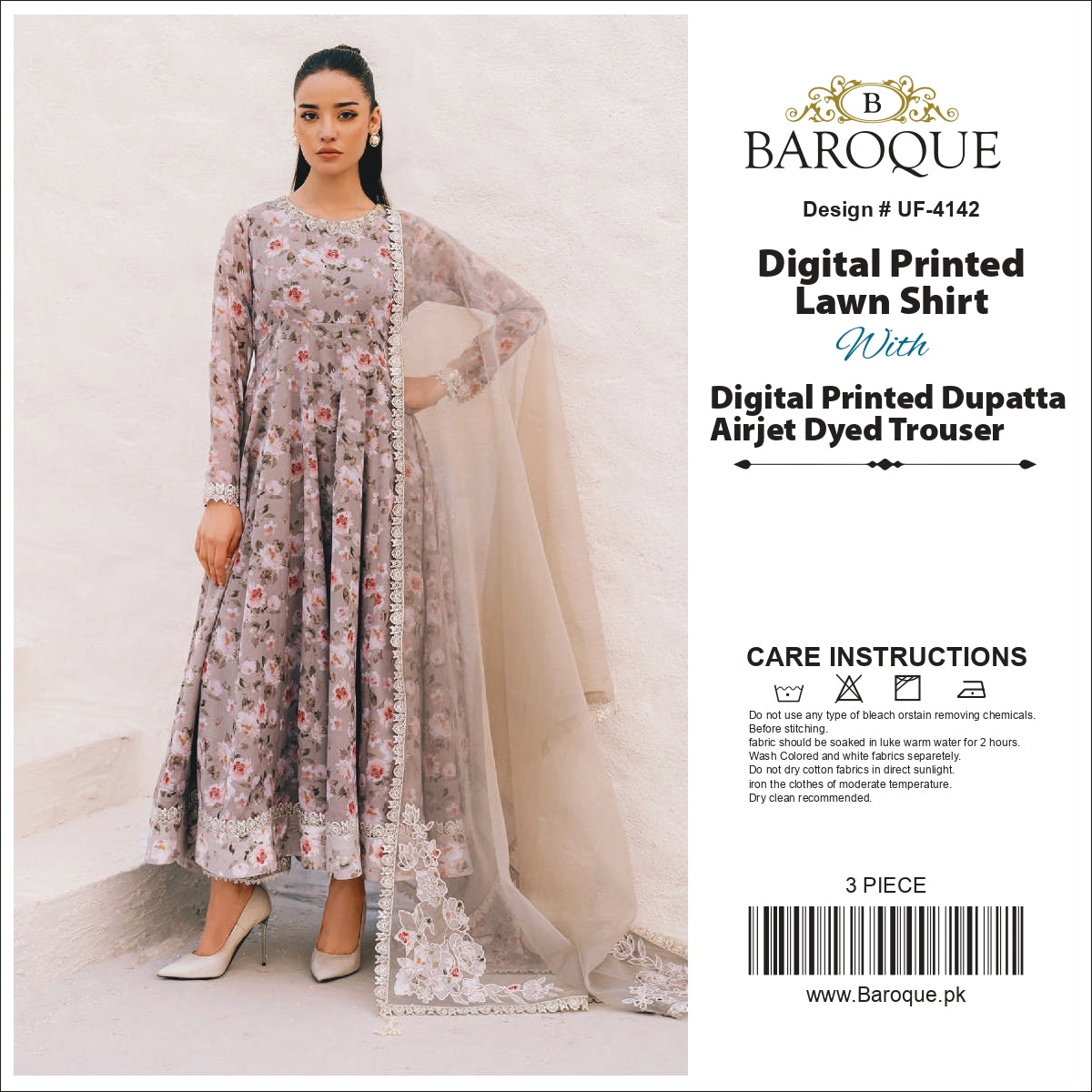 Beautiful digital printed lawn 3-piece suit featuring a soft lawn shirt, matching trouser, and printed dupatta. Lightweight, breathable fabric with fresh summer colors, perfect for daily wear and casual outing
