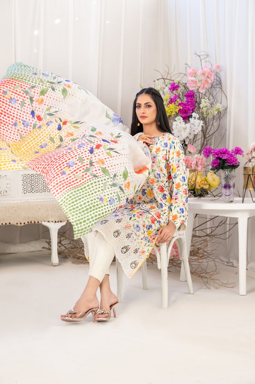 - Un-Stitched Daman Embroidered with Heavy Schiffli Jaal Digital Printed Viscose Front with Digital Printed Viscose Back & Sleeves Designs